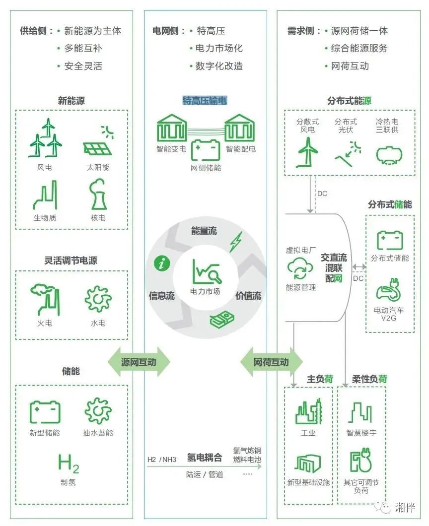 與傳統(tǒng)電力系統(tǒng)相比,它強調的是以“新能源”為主體,逐步提升光伏、風電等新能源發(fā)電的比例,并通過電網(wǎng)系統(tǒng)運行的變革,實現(xiàn)新能源高效開發(fā)利用和各類負荷的友好接入,提升終端電氣化率,通過發(fā)電、輸電、配電、用電等各環(huán)節(jié)的共同發(fā)力,最終實現(xiàn)電力行業(yè)減排降碳目標??梢哉f,新型電力系統(tǒng)是我們邁向碳達峰碳中和的關鍵所在。