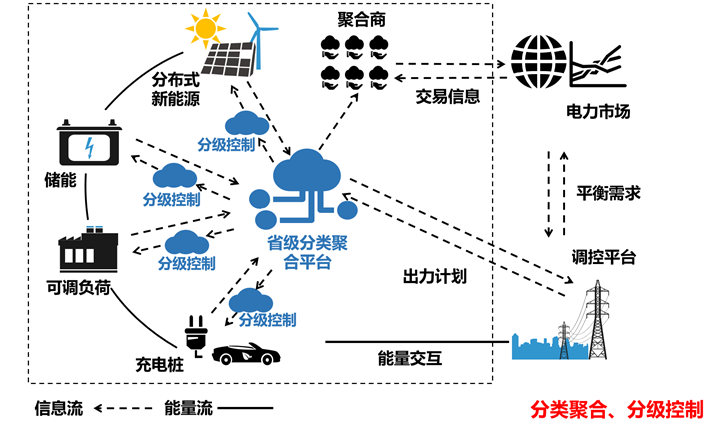 (十五)推動(dòng)源網(wǎng)荷儲(chǔ)電力資源分類分級(jí)聚合?;诮y(tǒng)一的數(shù)字底座、物聯(lián)采集與實(shí)時(shí)量測(cè)中心等技術(shù)架構(gòu),建立和完善省級(jí)源網(wǎng)荷儲(chǔ)分類聚合平臺(tái),通過(guò)統(tǒng)一平臺(tái)對(duì)源網(wǎng)荷儲(chǔ)四側(cè)資源分散聚合控制,實(shí)現(xiàn)電力系統(tǒng)分層分級(jí)的綜合動(dòng)態(tài)平衡。開展源網(wǎng)荷儲(chǔ)分類分級(jí)聚合頂層設(shè)計(jì),研究制定分類分級(jí)聚合的技術(shù)路徑和實(shí)施方案。推動(dòng)分布式光伏運(yùn)營(yíng)監(jiān)測(cè)平臺(tái)、配電監(jiān)控系統(tǒng)的升級(jí)改造和分級(jí)應(yīng)用,實(shí)現(xiàn)對(duì)分布式光伏的“剛性控”“柔性控”“群調(diào)群控”等多場(chǎng)景靈活控制。完善常規(guī)中小電源聚合平臺(tái),調(diào)動(dòng)中小電源深度聚合的積極性,提升中小電源統(tǒng)一調(diào)度能力,實(shí)現(xiàn)廣域協(xié)同、靈活互動(dòng)。深化建設(shè)新型負(fù)荷管理平臺(tái),提升新型負(fù)荷管理系統(tǒng)智能化、實(shí)用化水平,對(duì)負(fù)荷資源分層分類統(tǒng)一管理、統(tǒng)一調(diào)控、統(tǒng)一服務(wù)。建設(shè)用戶側(cè)儲(chǔ)能監(jiān)控平臺(tái),分級(jí)分類接入用戶側(cè)儲(chǔ)能電站數(shù)據(jù),實(shí)現(xiàn)海量用戶側(cè)儲(chǔ)能資源更大范圍的共享互濟(jì)和優(yōu)化配置。建立適應(yīng)源網(wǎng)荷儲(chǔ)分類分級(jí)聚合的調(diào)度模式和交易機(jī)制,貫穿省、市、縣三級(jí)調(diào)度系統(tǒng),制定并網(wǎng)管理、運(yùn)行控制相關(guān)標(biāo)準(zhǔn)規(guī)范,完善清潔能源、需求側(cè)資源和儲(chǔ)能參與電力市場(chǎng)的機(jī)制,依托統(tǒng)一的信息共享和技術(shù)支持平臺(tái),培育多類型聚合商參與分層分級(jí)聚合調(diào)度。構(gòu)建基于電網(wǎng)一張圖的新型電力系統(tǒng)全要素?cái)?shù)字底座,開展新型電力系統(tǒng)各要素承載力的可視化推演計(jì)算,實(shí)現(xiàn)配網(wǎng)各環(huán)節(jié)、各業(yè)務(wù)以及新要素的全面圖上管控,提升分布式資源消納能力。