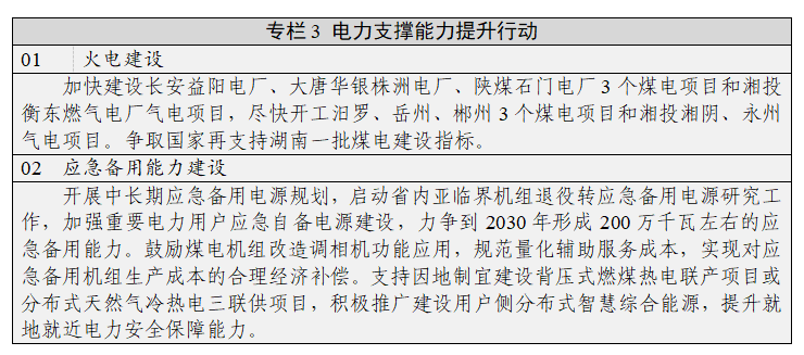 (八)提升電力應(yīng)急備用能力。加強(qiáng)極端形勢(shì)下電力風(fēng)險(xiǎn)管控,做好應(yīng)對(duì)自然災(zāi)害、尖峰負(fù)荷、大面積停電、電網(wǎng)攻擊等情況的保供預(yù)案,提高應(yīng)急處置和抗災(zāi)能力。開展中長(zhǎng)期應(yīng)急備用電源規(guī)劃,按照最大負(fù)荷3%—4%疊加新能源裝機(jī)容量1%—3%標(biāo)準(zhǔn)配置應(yīng)急備用電源規(guī)模。落實(shí)國(guó)家應(yīng)急備用電源管理要求,科學(xué)認(rèn)定和退出應(yīng)急備用機(jī)組,對(duì)符合能效、環(huán)保、安全等政策和標(biāo)準(zhǔn)要求的退役火電機(jī)組,按照“關(guān)而不拆”原則轉(zhuǎn)為應(yīng)急備用電源,做好設(shè)備維護(hù)和燃料供應(yīng)保障。支持分布式天然氣發(fā)電項(xiàng)目建設(shè),在有規(guī)模熱(冷)負(fù)荷的工業(yè)園區(qū)、經(jīng)濟(jì)開發(fā)區(qū)、空港新區(qū)等區(qū)域,因地制宜建設(shè)背壓式燃煤熱電聯(lián)產(chǎn)項(xiàng)目或分布式天然氣冷熱電三聯(lián)供項(xiàng)目,積極推廣建設(shè)用戶側(cè)分布式智慧綜合能源,提升就地就近電力安全保障能力。加強(qiáng)政府、醫(yī)院、鐵路、民航等重要電力用戶應(yīng)急自備電源建設(shè),力爭(zhēng)實(shí)現(xiàn)應(yīng)配盡配全面覆蓋,電源容量應(yīng)滿足全部保安負(fù)荷需求。加強(qiáng)抽水蓄能電站應(yīng)急備用能力建設(shè),推動(dòng)抽水蓄能電站具備黑啟動(dòng)功能。做好一次能源監(jiān)測(cè)預(yù)警和供應(yīng)協(xié)調(diào),提升電源發(fā)電能力,利用負(fù)荷和電源的時(shí)空互補(bǔ)特性,有效提高湖南與其他區(qū)域間電力互補(bǔ)互濟(jì)、調(diào)劑余缺能力。
