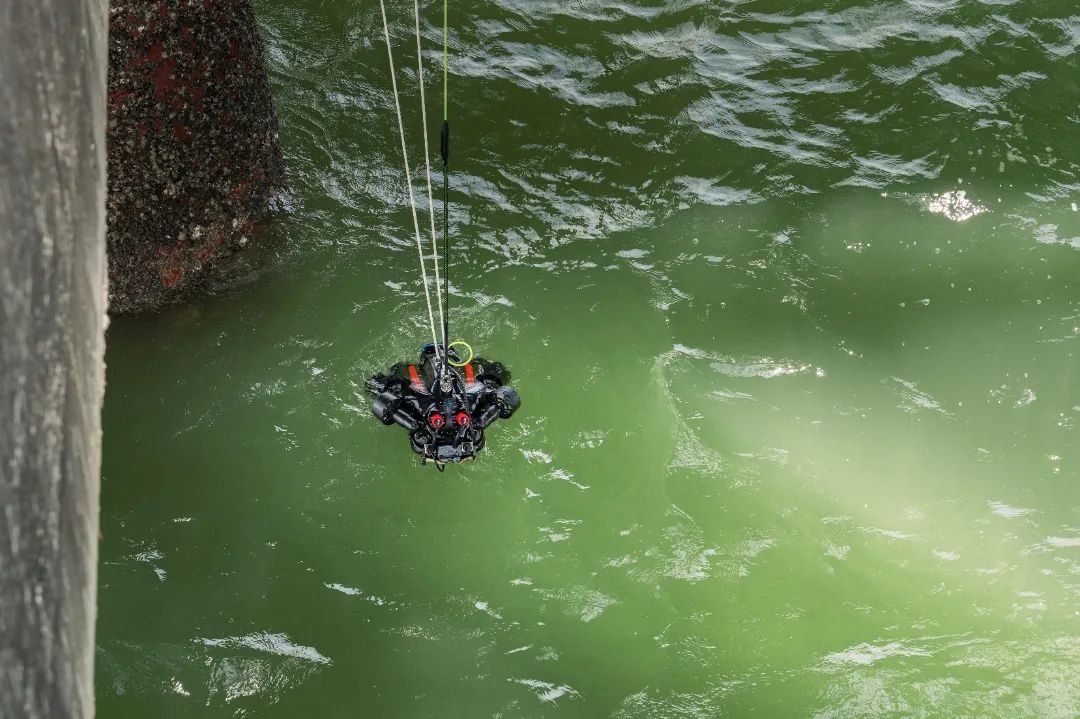 ▲水下智能巡檢機(jī)器人可對(duì)海上架空輸電線(xiàn)路樁基礎(chǔ)進(jìn)行探傷檢測(cè)和可見(jiàn)光巡查。(黃海鵬 攝)