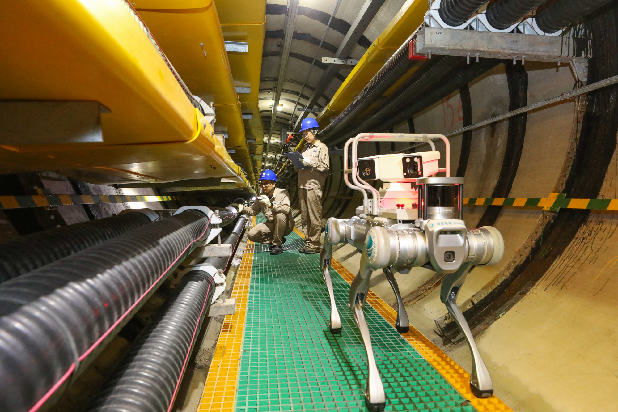 國網(wǎng)天津電纜公司運行人員應(yīng)用四足巡檢機器人對電纜隧道進(jìn)行自主紅外測溫巡檢(央廣網(wǎng)發(fā) 國網(wǎng)天津電力供圖)