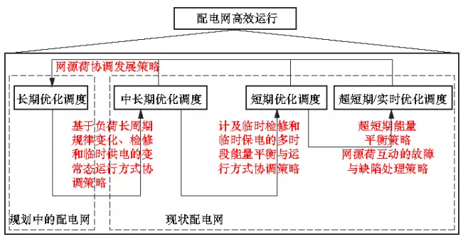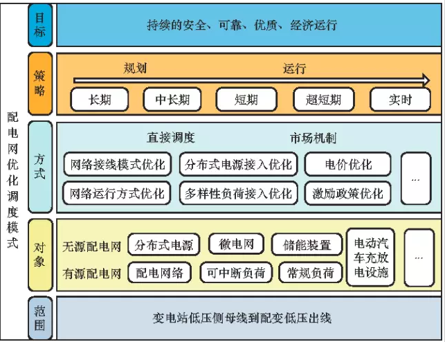 根據(jù)上述分析,本文提出了在時(shí)間尺度上形成“長(zhǎng)期—中長(zhǎng)期—短期—超短期/實(shí)時(shí)”的多時(shí)間尺度遞進(jìn)式優(yōu)化調(diào)度策略,并以“局部平衡—分區(qū)協(xié)調(diào)—整體吸納”為原則,協(xié)調(diào)分布式電源、微電網(wǎng)、儲(chǔ)能裝置、可控負(fù)荷等調(diào)度對(duì)象,從而達(dá)到提高配電網(wǎng)供電可靠性與經(jīng)濟(jì)性,實(shí)現(xiàn)智能配電系統(tǒng)高效運(yùn)行的目標(biāo)。優(yōu)化調(diào)度模式層次結(jié)構(gòu)如圖2所示。