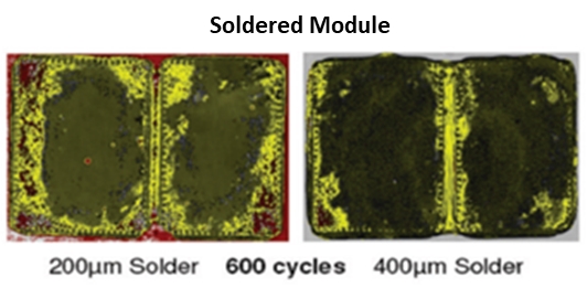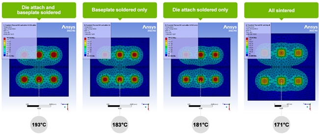 有關(guān)于同工況下,使用芯片下及系統(tǒng)級燒結(jié)銀連接方案,將會比單單在芯片下使用燒結(jié)銀方案,系統(tǒng)溫度將下降約10℃。比全軟焊料解決方案下降更多,能達到約20℃的顯著效果。