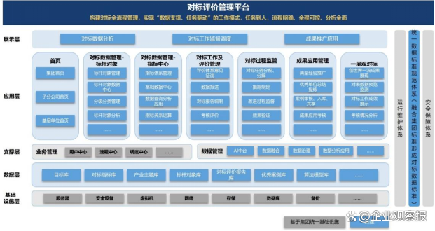 “一個平臺”,即面向集團公司的領導、集團部門、子分公司、基層單位等多類用戶,建立“建標、立標、對標、達標、創(chuàng)標”對標規(guī)范化閉環(huán)管理的,集團統(tǒng)一、自主可控的數(shù)智化對標管理平臺,確保集團“對標評價管理”的可持續(xù)性和動態(tài)性,提高集團對標工作數(shù)字化、智能化水平,提高集團和各級公司信息的共享度和透明度。