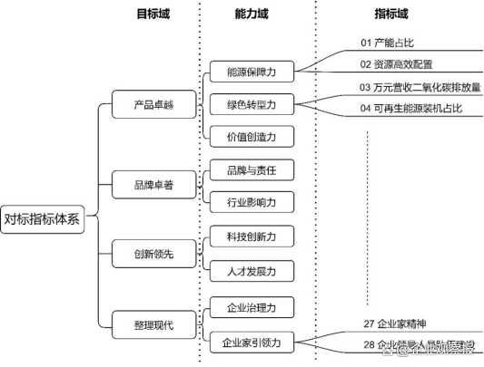 “一個體系”,即構建業(yè)績維度和管理要素并重的,滿足全集團統(tǒng)一、多級貫通的世界一流企業(yè)對標指標體系。對標指標體系重點體現(xiàn)“產(chǎn)品卓越、品牌卓著、創(chuàng)新領先、治理現(xiàn)代”十六字標準和“創(chuàng)新力、競爭力、治理力、影響力、引領力”五力要求,結合集團未來發(fā)展方向、定位和目標等進行選擇和設置,通過分級分類建立集團各級子公司的對標指標體系,形成涵蓋集團公司綜合對比指標體系及子分公司等若干產(chǎn)業(yè)特色共性指標,實現(xiàn)傳導壓力、激發(fā)動力,進而增強創(chuàng)建世界一流企業(yè)行動的系統(tǒng)性、針對性和有效性。