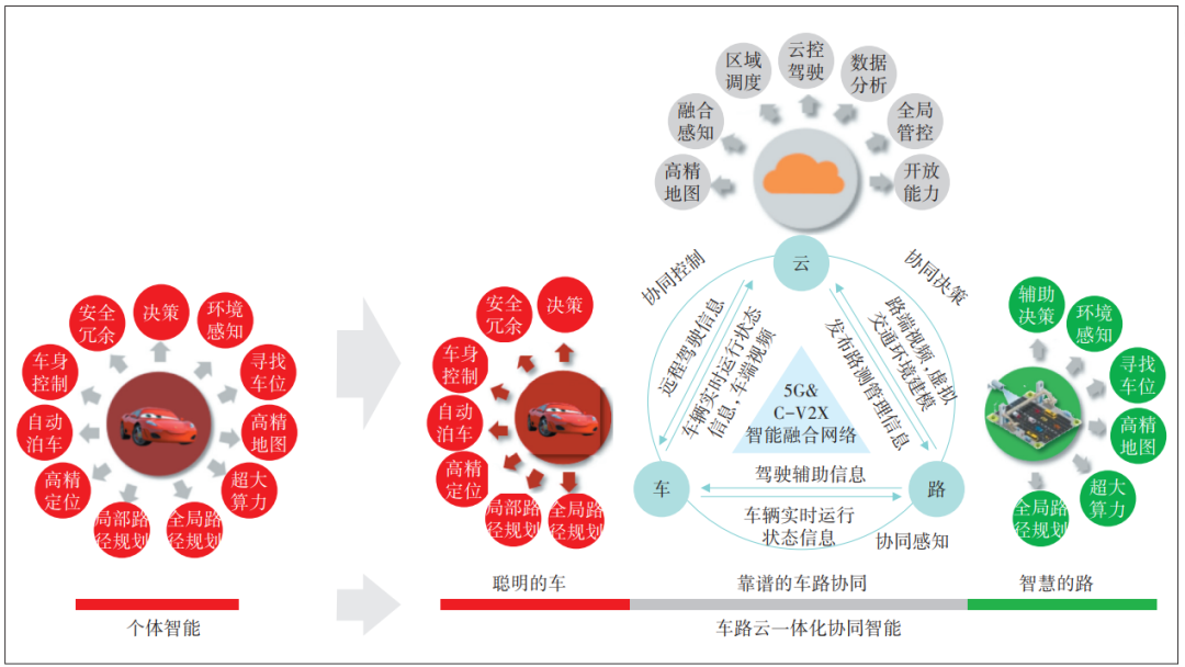 隨著車(chē)輛智能化水平的不斷提高,車(chē)載計(jì)算設(shè)備的算力逐漸難以滿足復(fù)雜路況下實(shí)時(shí)處理大量數(shù)據(jù)的需求,既是成本瓶頸,也是能力瓶頸。為解決這一問(wèn)題,行業(yè)研究出車(chē)路云一體化的技術(shù)演進(jìn)路線(見(jiàn)圖5)。此方案體系下,車(chē)輛通過(guò)高速穩(wěn)定的通信網(wǎng)絡(luò)與云端服務(wù)器、道路感知設(shè)備進(jìn)行實(shí)時(shí)數(shù)據(jù)交互。云端強(qiáng)大的計(jì)算能力既可對(duì)車(chē)輛上傳的大量傳感器數(shù)據(jù)進(jìn)行快速處理和分析,也可處理道路感知設(shè)備上報(bào)的實(shí)時(shí)道路信息和交通狀況。平臺(tái)綜合分析后將決策指令及時(shí)反饋給車(chē)輛,從而輔助車(chē)輛做出更精準(zhǔn)的決策。車(chē)路云一體化的技術(shù)方案可有效彌補(bǔ)車(chē)輛自身算力不足,進(jìn)一步提升智能網(wǎng)聯(lián)車(chē)輛的運(yùn)行效率和安全性,并為降低智能駕駛成本推動(dòng)智能網(wǎng)聯(lián)汽車(chē)快速普及,助力智能交通發(fā)展提供堅(jiān)實(shí)基礎(chǔ)。