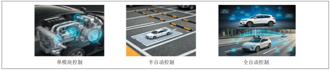智能網(wǎng)聯(lián)汽車(chē)的技術(shù)演進(jìn)歷程一般分為3個(gè)階段(見(jiàn)圖4)。第1階段是單模塊控制階段,車(chē)輛各個(gè)關(guān)鍵部件如動(dòng)力系統(tǒng)、制動(dòng)系統(tǒng)等都各自配備獨(dú)立的控制模塊,模塊之間協(xié)同性較差,只能實(shí)現(xiàn)基礎(chǔ)、相對(duì)簡(jiǎn)單的功能,例如簡(jiǎn)單的定速巡航,車(chē)輛無(wú)法自主應(yīng)對(duì)復(fù)雜路況;第2階段是半自動(dòng)控制階段,部分駕駛?cè)蝿?wù)可以由車(chē)輛自動(dòng)完成,例如記憶泊車(chē)功能,車(chē)輛能夠自動(dòng)識(shí)別停車(chē)位并精準(zhǔn)控制轉(zhuǎn)向、速度等完成泊車(chē)動(dòng)作,但仍需要駕駛員參與;第3階段是全自動(dòng)控制階段,車(chē)輛已達(dá)成真正意義上的高度智能化與自主化。車(chē)輛依托自身及周邊環(huán)境多傳感器融合技術(shù)構(gòu)建起全方位、高精度的環(huán)境感知體系,并基于云端智能網(wǎng)聯(lián)平臺(tái)的強(qiáng)大賦能,具備強(qiáng)大的駕駛決策能力,可實(shí)時(shí)調(diào)整行駛策略以應(yīng)對(duì)復(fù)雜多變交通場(chǎng)景,全程無(wú)需駕駛員任何干預(yù)。