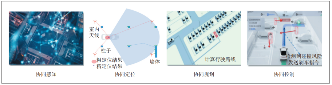 典型場(chǎng)景如智慧泊車(chē),通過(guò)協(xié)同感知、協(xié)同定位、協(xié)同規(guī)劃和協(xié)同控制等技術(shù)實(shí)現(xiàn)高效、智能的停車(chē)管理和服務(wù)(見(jiàn)圖1)。智慧泊車(chē)的技術(shù)核心是根據(jù)多源傳感器異構(gòu)算法聯(lián)合感知的異步動(dòng)態(tài)協(xié)同感知系統(tǒng),基于場(chǎng)側(cè)的無(wú)線通信技術(shù)和車(chē)輛即時(shí)定位與地圖構(gòu)建技術(shù)的協(xié)同定位系統(tǒng),同時(shí)基于先驗(yàn)地圖和實(shí)時(shí)路況的全局路徑調(diào)度和車(chē)輛感知的局部軌跡規(guī)劃的協(xié)同系統(tǒng),以及場(chǎng)端原始感知數(shù)據(jù)及預(yù)測(cè)與車(chē)輛實(shí)時(shí)規(guī)劃軌跡的實(shí)時(shí)干涉控制系統(tǒng),實(shí)現(xiàn)車(chē)路云一體化的泊車(chē)服務(wù)。