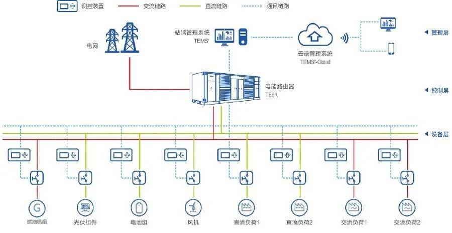 基于電力電子變壓器的交直流混合微網(wǎng)系統(tǒng)總體可分為三層架構。第一層為設備層,主要囊括了分布式電源(風電、光伏系統(tǒng)等)和不同的交直流負荷;第二層控制層,以電力電子變壓器為核心,分布式電源和負荷可通過其靈活的多端口配置實現(xiàn)可靠接入,并通過其中/高壓接口,實現(xiàn)與配電網(wǎng)的有效連接;第三層為管理層,以“雙端”能量管理系統(tǒng)為核心,采用人工智能算法可實現(xiàn)電力電子變壓器交直流混合系統(tǒng)的分布式能源互補優(yōu)化以及多個端口之間的協(xié)調(diào)控制,提高能源利用效率,多機并聯(lián)系統(tǒng)的集群控制、功率在線優(yōu)化分配,保障系統(tǒng)效率最優(yōu),同時能夠?qū)与娋W(wǎng)調(diào)度,參與電力市場交易及輔助服務等,真正實現(xiàn)綠色數(shù)據(jù)中心電能的智能路由。