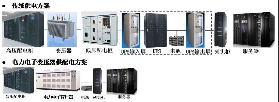 數(shù)據(jù)中心傳統(tǒng)的UPS供電方案,是由高壓配電柜、變壓器、低壓配電柜、UPS等組成,雖然系統(tǒng)方案成熟,但由于設備種類數(shù)量多,電能變換環(huán)節(jié)多,占地面積大,轉(zhuǎn)換效率低,已有被逐步淘汰的趨勢。