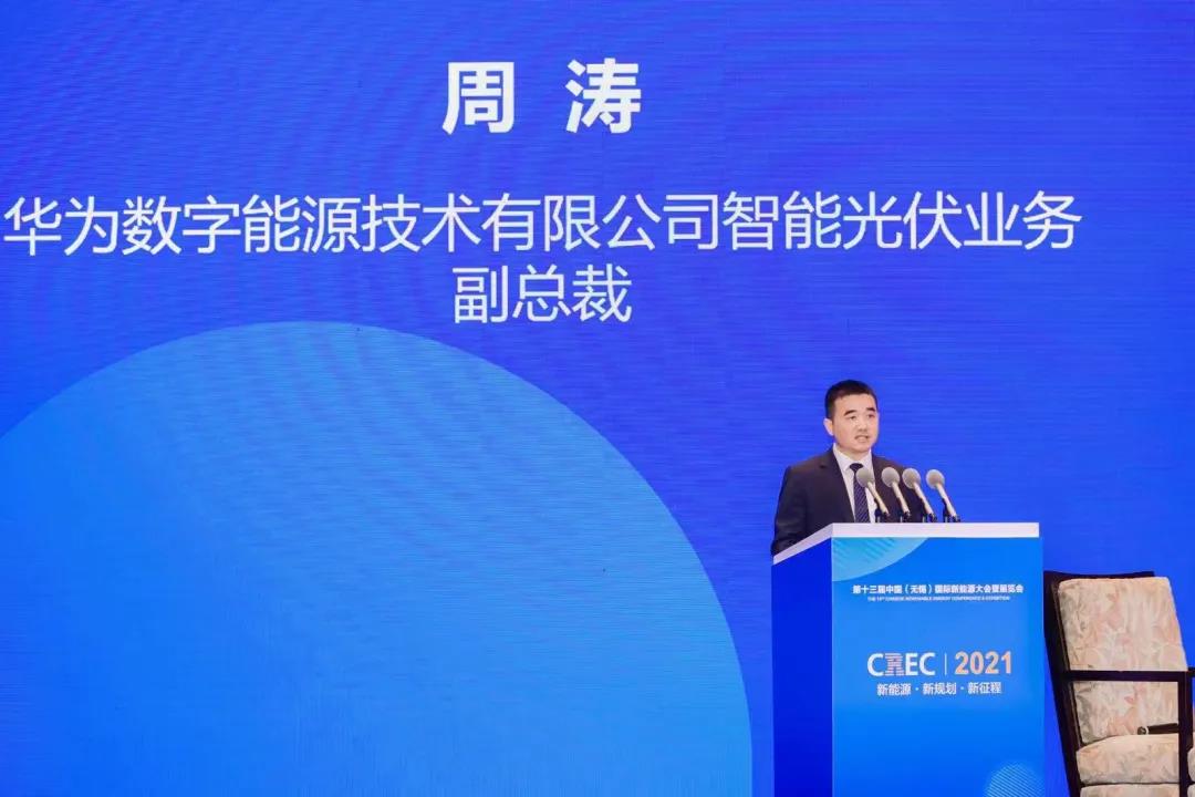 在4日下午本次大會(huì)主論壇“2021全球新能源產(chǎn)業(yè)峰會(huì)”上,華為數(shù)字能源技術(shù)有限公司智能光伏業(yè)務(wù)副總裁周濤帶來(lái)了《光儲(chǔ)融合,全面智能 打造面向未來(lái)的智能光儲(chǔ)系統(tǒng),助力構(gòu)建新型電力系統(tǒng)》的主題演講。演講以構(gòu)建新能源為主體的新型電力系統(tǒng)出發(fā),圍繞碳達(dá)峰、碳中和能源行業(yè)革命,詳細(xì)介紹了華為數(shù)字能源技術(shù)在改善電網(wǎng)和提高光伏、儲(chǔ)能上的產(chǎn)品和技術(shù)應(yīng)用,展現(xiàn)了華為智能光伏解決方案的創(chuàng)新和引領(lǐng)作用。