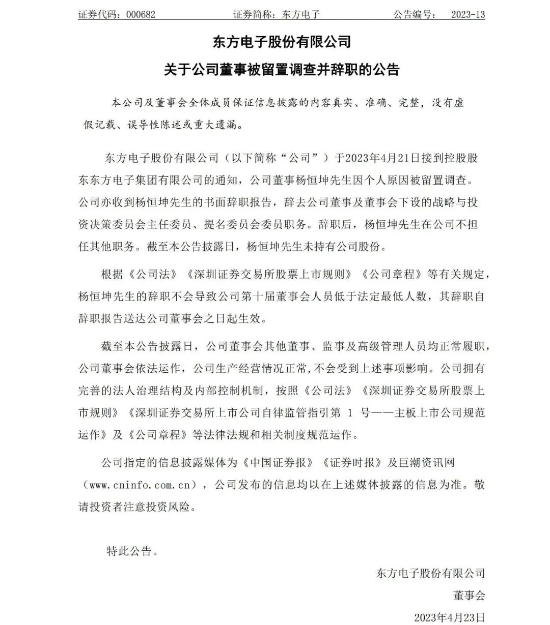 東方電子集團所屬上市公司東方電子4月23日晚間公告稱,公司董事楊恒坤先生因個人原因被留置調(diào)查。