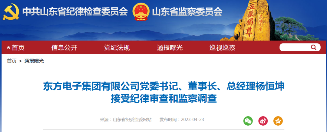 山東省紀委監(jiān)委網(wǎng)站4月23日消息,據(jù)煙臺市紀委監(jiān)委消息:東方電子集團有限公司黨委書記、董事長、總經(jīng)理楊恒坤涉嫌嚴重違紀違法,目前正接受煙臺市紀委監(jiān)委紀律審查和監(jiān)察調(diào)查。