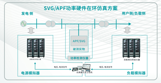 在電力系統(tǒng)應用場景中,PAS放大器與仿真器的結(jié)合,能夠?qū)Πl(fā)電側(cè)和負載側(cè)進行數(shù)字化模擬,結(jié)合功率檢測儀的實測數(shù)據(jù),通過數(shù)據(jù)采集系統(tǒng),可實現(xiàn)以APF,SVG為被測設(shè)備的半實物功率硬件在環(huán)仿真測試。