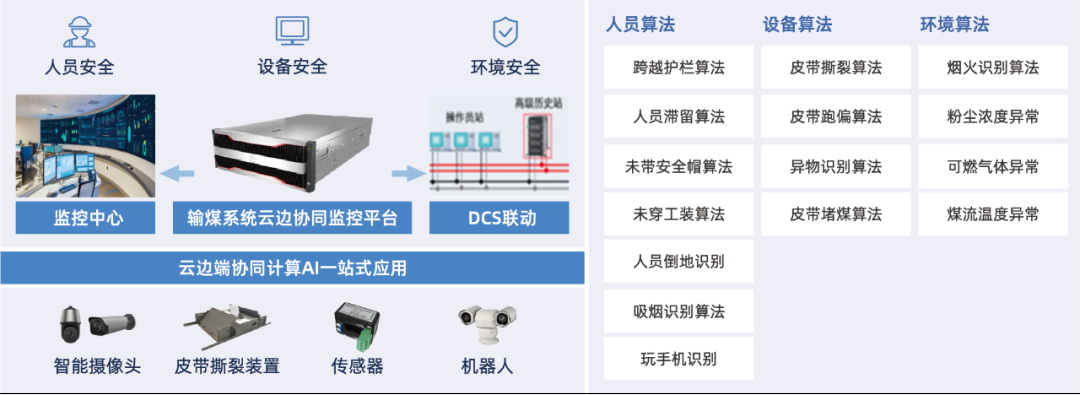 方案通過云邊端協(xié)同架構(gòu)把智能采集裝置、皮帶撕裂識別裝置、環(huán)境傳感器等進(jìn)行數(shù)據(jù)的統(tǒng)一匯聚分析,對異常情況進(jìn)行識別和報警,并通過DCS系統(tǒng)控制聯(lián)動,提高人員、設(shè)備、環(huán)境的安全管理水平。 在設(shè)備故障監(jiān)測方面,可對皮帶異物、落煤口堵煤、皮帶跑偏、運行環(huán)境火花等情況進(jìn)行識別,避免異物運輸對皮帶造成意外損傷或引發(fā)事故;在人員安全管控方面,設(shè)置吸煙、安全帽佩戴、翻越護(hù)欄、人員倒地等相關(guān)算法,對巡檢人員的不安全行為進(jìn)行識別管控;在環(huán)境監(jiān)控方面,通過安裝布設(shè)有毒有害氣體監(jiān)測傳感器、溫度傳感器、粉塵監(jiān)測傳感器等對輸煤環(huán)境進(jìn)行在線實時監(jiān)測,及時發(fā)現(xiàn)高溫、有毒有害氣體超標(biāo)、粉塵濃度超標(biāo)并預(yù)警,最大程度保障人員操作環(huán)境安全。