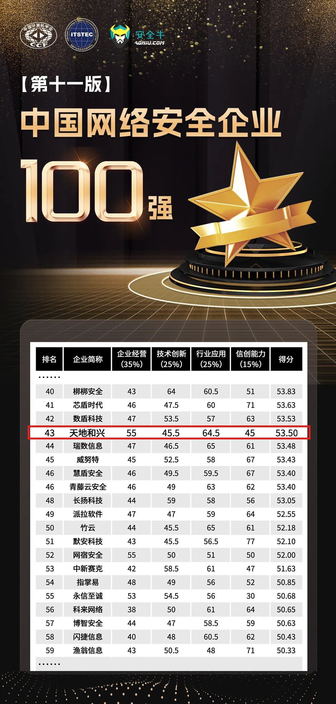 近日,由中國(guó)計(jì)算機(jī)學(xué)會(huì)抗惡劣環(huán)境計(jì)算機(jī)專業(yè)委員會(huì)、信息產(chǎn)業(yè)信息安全測(cè)評(píng)中心、安全牛聯(lián)合發(fā)起的第十一版《中國(guó)網(wǎng)絡(luò)安全企業(yè)100強(qiáng)》正式發(fā)布。天地和興憑借在工業(yè)網(wǎng)絡(luò)安全領(lǐng)域多年的深耕及亮眼成績(jī),從300余家安全廠商中脫穎而出,連續(xù)五年上榜“中國(guó)網(wǎng)絡(luò)安全企業(yè)100強(qiáng)”。