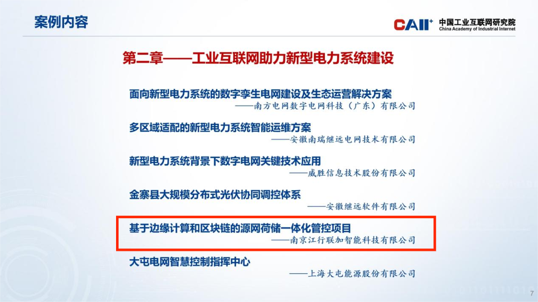 江行智能“基于邊緣計算和區(qū)塊鏈的源網荷儲一體化管控項目”從近百份能源工業(yè)互聯(lián)網相關案例中脫穎而出,作為新型電力系統(tǒng)建設的典型案例入選。