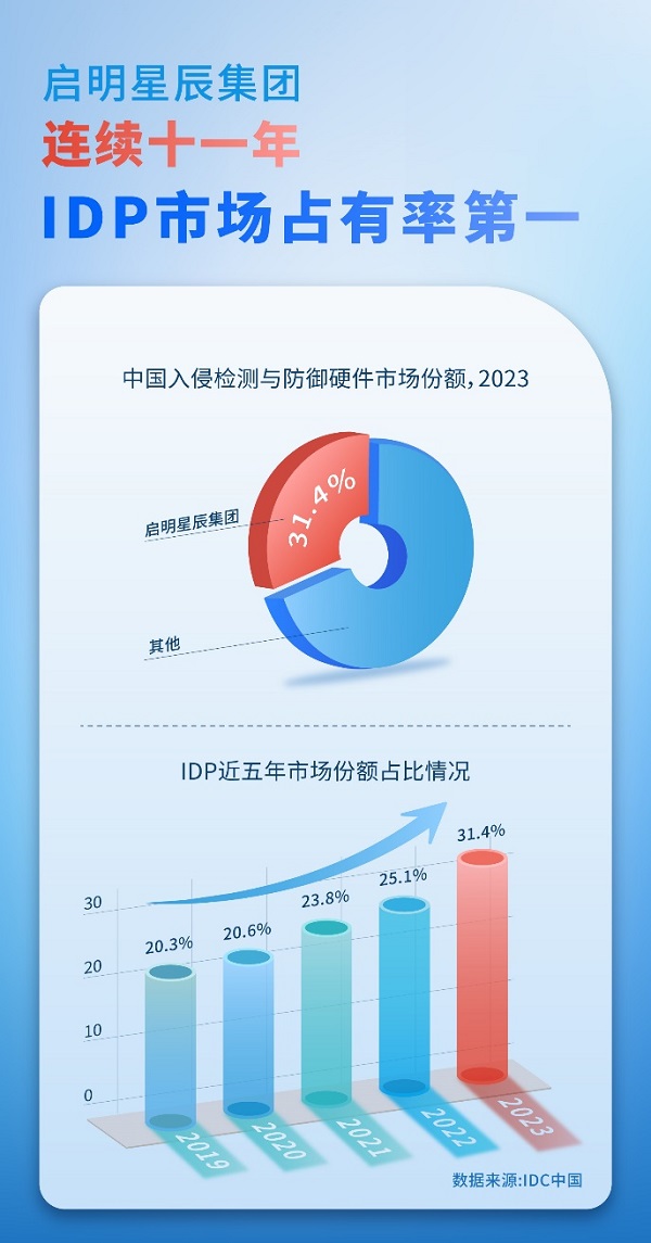 本網(wǎng)訊 近日,IDC發(fā)布《2023年第四季度中國IT安全硬件市場跟蹤報告》。報告顯示,2023年啟明星辰集團入侵檢測與防御(IDP)以31.4%的市場份額再次蟬聯(lián)國內(nèi)市場第一。至此,啟明星辰集團已連續(xù)十一年領跑IDP市場,且連續(xù)多年份額占比持續(xù)攀升!