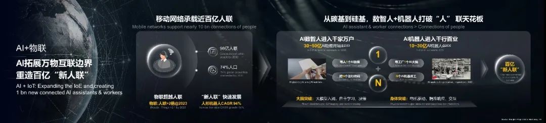 第三,移動AI時代將極大拓展萬物互聯(lián)的邊界。隨著機器獲得類人的思維和移動性能力,網絡聯(lián)接將從“碳基人”拓展到“硅基人”,再造百億新人聯(lián)。對于個人,未來每個人都將擁有一個AI助理,跨手機、眼鏡和新型AI終端運行。AI數智人從工具進化為伙伴,實時響應生活、工作、學習全場景需求;對于行業(yè),每一個智慧工廠將配備AI大腦,驅動AI機器員工深入各生產環(huán)節(jié)。AI機器員工將具備自主學習和精準響應的能力,使能生產、維護、質檢、物流等全場景提質增效。“數智人”和“機器人”將突破傳統(tǒng)聯(lián)接天花板,創(chuàng)造數百億的“新人聯(lián)”,引領人機融合的新紀元。