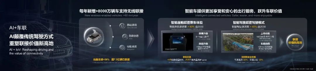 第二,智能網聯(lián)汽車將顛覆傳統(tǒng)駕駛方式,提供更加愉悅和安心的出行服務。智能座艙,將顛覆人們的乘車體驗。Gbps網絡體驗支持智慧助手、多屏觀看和XR應用等需求,使車輛成為集休閑、娛樂和工作于一體的'移動第三空間'。智能駕駛,將顛覆傳統(tǒng)的駕駛模式。通過每月百GB的數據上傳訓練,智駕系統(tǒng)不斷提高模型準確性,精準識別和響應多樣化交通環(huán)境;同時,基于毫秒級的車路協(xié)同,將實時提供穩(wěn)定可靠的駕駛策略。智能網聯(lián)汽車將兌現車聯(lián)體驗價值,進一步帶來時間價值和安全價值,重塑聯(lián)接價值的新高地。