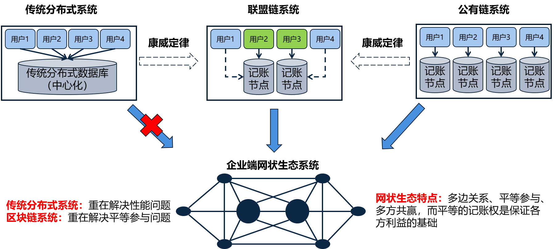 社會環(huán)境已經(jīng)從具有較強(qiáng)依附關(guān)系的中心化輻射狀生態(tài)結(jié)構(gòu)逐漸演進(jìn)至平臺化、多中心、自由協(xié)作的網(wǎng)狀體系,尤其是在企業(yè)端,根據(jù)康威定律,設(shè)計(jì)對象的組織結(jié)構(gòu)會映射到其系統(tǒng)結(jié)構(gòu),所以,符合多中心網(wǎng)狀生態(tài)特點(diǎn)的系統(tǒng)架構(gòu)必然會應(yīng)運(yùn)而生。傳統(tǒng)的分布式系統(tǒng)其誕生目的主要是為了提升系統(tǒng)性能,而區(qū)塊鏈系統(tǒng)則更多考慮了如何幫助用戶平等參與網(wǎng)絡(luò),這應(yīng)該是二者在設(shè)計(jì)理念上的核心差別,因此,區(qū)塊鏈系統(tǒng)比傳統(tǒng)的分布式系統(tǒng)更適于多方共贏生態(tài)環(huán)境的構(gòu)建。這個是看起來有點(diǎn)兒“務(wù)虛”,但是也有其道理的聯(lián)盟鏈的價值。公鏈的問題在于,如果現(xiàn)階段應(yīng)用,顯然不符合企業(yè)端生態(tài)的實(shí)際情況,企業(yè)端的生態(tài)環(huán)境即便你一開始沒設(shè)計(jì)中心也會自然產(chǎn)生中心,這是人的社會性決定的,所以也不要那么排斥所謂的“中心化”,鏡子中照出來的無論好不好看都是你自己,化妝不解決本質(zhì)問題。