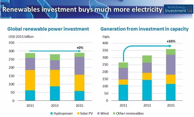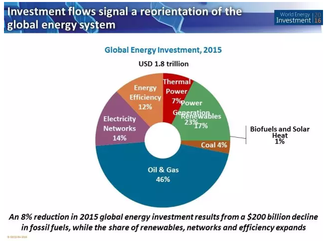 2015年電力行業(yè)投資達到了創(chuàng)紀(jì)錄的6900億美元,超過能源總投資的37%。可再生能源投資占17%,約占了電力投資的一半??稍偕茉赐顿Y中,16%來自發(fā)電,生物和太陽能只占1%。