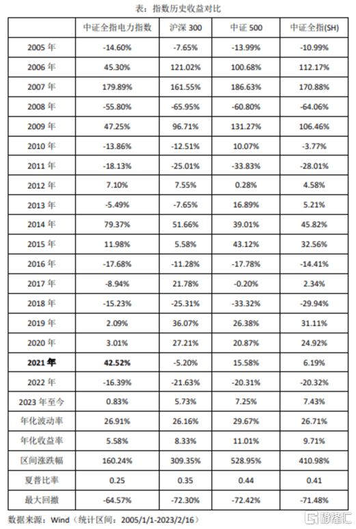 再來(lái)看過(guò)往收益率,據(jù)WIND統(tǒng)計(jì)顯示,自基日(2014年12月31日)以來(lái),截至2023年2月16日,中證全指電力指數(shù)年化收益率約5.6%,整體表現(xiàn)落后于大盤基準(zhǔn)(中證全指)。此外,該指數(shù)的年化波動(dòng)率為26.9%,同樣低于部分大盤指數(shù)。不過(guò)自2021年起,由于電力市場(chǎng)化改革的加速,該指數(shù)取得了42.5%的收益,遠(yuǎn)遠(yuǎn)領(lǐng)先其他大盤指數(shù)。同時(shí),其2022年的表現(xiàn)也領(lǐng)先大盤指數(shù)。