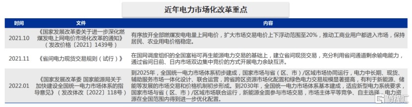 2019年9月,我國(guó)將煤電上網(wǎng)電價(jià)機(jī)制由標(biāo)桿電價(jià)改為“基準(zhǔn)浮動(dòng)”機(jī)制。2021年10月8日,國(guó)常會(huì)即提出改革完善煤電價(jià)格市場(chǎng)化形成機(jī)制,提出燃煤發(fā)電量原則上全部進(jìn)入市場(chǎng),浮動(dòng)范圍擴(kuò)大至正負(fù)20%,高耗能行業(yè)電價(jià)不受限制。