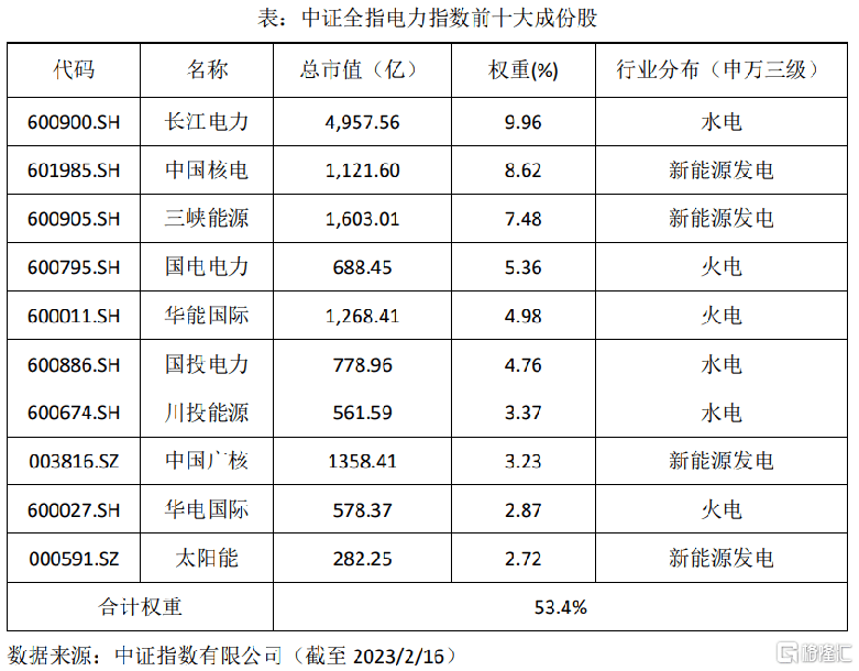 目前,中證全指電力指數(shù)(H30199.CSI)正是一個(gè)標(biāo)準(zhǔn)的電力行業(yè)指數(shù)---選取中證全指樣本股中的電力公用事業(yè)行業(yè)股票組成,以反映該行業(yè)股票的整體表現(xiàn)。據(jù)WIND統(tǒng)計(jì)顯示,截至2023年2月16日收盤計(jì),全指電力指數(shù)共包含54只成份股,平均個(gè)股市值434.64億元。