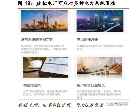 虛擬電廠具有需求側(cè)響應(yīng)、多負(fù)荷管理等多種功能,可應(yīng)對發(fā)電系統(tǒng)多樣化困難。虛擬 電廠可以應(yīng)對發(fā)電系統(tǒng)不穩(wěn)定性(風(fēng)光隨機(jī)性和間歇性對能源系統(tǒng)平衡造成挑戰(zhàn))、電力需 求沖擊(大量電動汽車隨機(jī)接入,對能源系統(tǒng)造成沖擊)、調(diào)控難度大(分布式能源增多, 導(dǎo)致動態(tài)調(diào)度與控制難度提升)和用戶需求日益提升等多種困難。