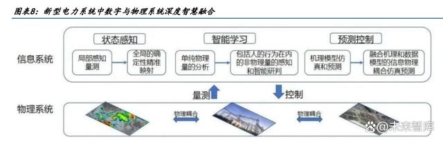 智慧融合是構(gòu)建新型電力系統(tǒng)的基礎(chǔ)。新型電力系統(tǒng)以數(shù)據(jù)為核心驅(qū)動(dòng),呈現(xiàn)數(shù)字與物理 系統(tǒng)深度融合特點(diǎn),系統(tǒng)控制運(yùn)行由“量測(cè)-控制”模式向多物理系統(tǒng)的狀態(tài)感知、智能 學(xué)習(xí)和預(yù)測(cè)控制等方式轉(zhuǎn)變。1)狀態(tài)感知:電網(wǎng)內(nèi)外參與耦合運(yùn)行的物理系統(tǒng),將從局 部的感知量測(cè),向全局的確定性精準(zhǔn)映射轉(zhuǎn)變。2)智能學(xué)習(xí):由于參與要素的多樣性,將 從單純物理量的分析,向包括人的行為在內(nèi)的非物理量的感知和智能研判進(jìn)行轉(zhuǎn)變。3) 預(yù)測(cè)控制:將從電力物理系統(tǒng)的機(jī)理模型仿真和預(yù)測(cè),向融合機(jī)理和數(shù)據(jù)模型的信息物理 耦合仿真預(yù)測(cè)轉(zhuǎn)變,提升隨機(jī)變量的預(yù)測(cè)精度,并應(yīng)用于電網(wǎng)逐級(jí)調(diào)控和控制引導(dǎo)。
