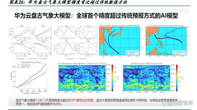 華為盤古氣象大模型精度首次超過傳統(tǒng)數(shù)值方法,速度提升 10000 倍以上。華為云發(fā)布 的盤古氣象大模型 1 小時(shí)-7 天預(yù)測(cè)精度均高于傳統(tǒng)數(shù)值方法,同時(shí)預(yù)測(cè)速度提升 10000 倍,能夠提供秒級(jí)的全球氣象預(yù)報(bào)(傳統(tǒng)數(shù)值預(yù)測(cè)方法無法做到),包括位勢(shì)、濕度、風(fēng) 速、溫度、海平面氣壓等。同時(shí),盤古氣象大模型在一張 V100 顯卡上,只需要 1.4 秒就 能完成 24 小時(shí)的全球氣象預(yù)報(bào)。