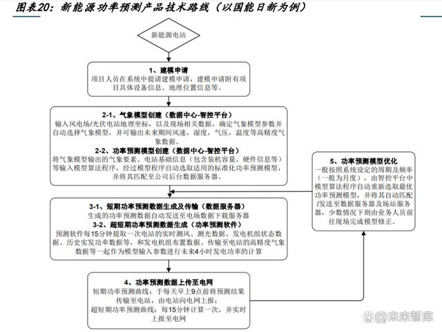 新能源功率產(chǎn)品每日工作流程(以國(guó)能日新產(chǎn)品為例):①獲得原始?xì)庀箢A(yù)報(bào)數(shù)據(jù)、②通 過建模計(jì)算后得到更高精度的氣象預(yù)測(cè)數(shù)據(jù)、③進(jìn)行短期功率預(yù)測(cè)數(shù)據(jù)計(jì)算、④傳輸短期 功率數(shù)據(jù)到所服務(wù)電站、⑤在電站軟件中進(jìn)行超短功率預(yù)測(cè)、⑥報(bào)送數(shù)據(jù)至電網(wǎng)調(diào)度部門。