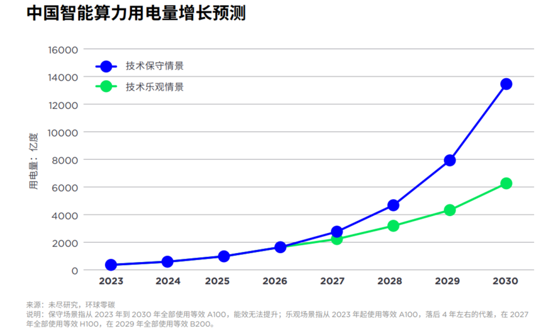 報(bào)告估算出,從2023年到2030年,中國(guó)智能算力規(guī)模將以每年70%的復(fù)合增長(zhǎng)率持續(xù)攀升。至2030 年,全國(guó)智算中心年用電量在0.6萬億度-1.3萬億度,約占當(dāng)年全社會(huì)用電量的5%-10%。
