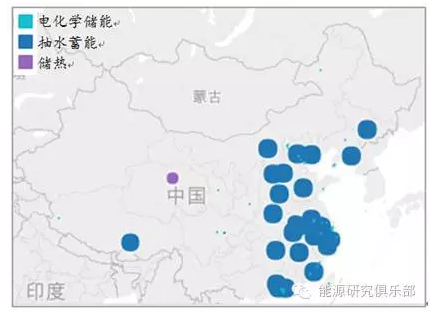 目前來看,我國儲能產(chǎn)業(yè)還處于發(fā)展的初期階段,以應(yīng)用示范為主。據(jù)美國能源部全球儲能數(shù)據(jù)庫2016年8月16日更新數(shù)據(jù)顯示,中國累計儲能總裝機(jī)32.10GW(94個在運(yùn)行項目),其中抽水蓄能32GW(34個在運(yùn)項目)、電化學(xué)儲能0.05GW(58個在運(yùn)項目)、儲熱0.05GW(2個)。抽水蓄能電站和電化學(xué)儲能項目都主要集中在我國東部沿海城市,詳見圖6。