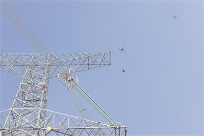 在特高壓線路檢修期間,檢修人員在塔上作業(yè)。地面工作人員通過載重無人機吊裝,把工器具送上塔位,同時利用無人機實時全程監(jiān)控。 杜衡 攝