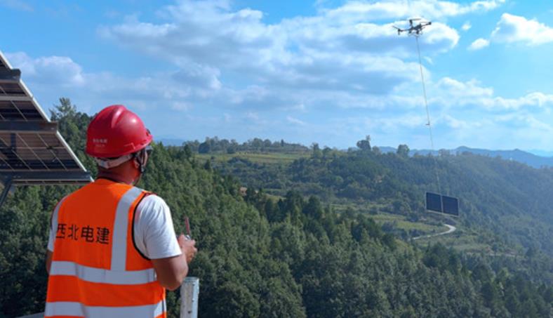 升空飛翔的無人機(jī),搭載著一塊塊光伏組件,穿梭于藍(lán)天與高山之間,輕松抵達(dá)指定位置。它們憑借強(qiáng)大的運載能力、廣闊的視野、優(yōu)異的機(jī)動性能以及便捷的操作方式,完美解決了傳統(tǒng)運輸方式中的路況差、坡度陡、材料運輸難等問題。