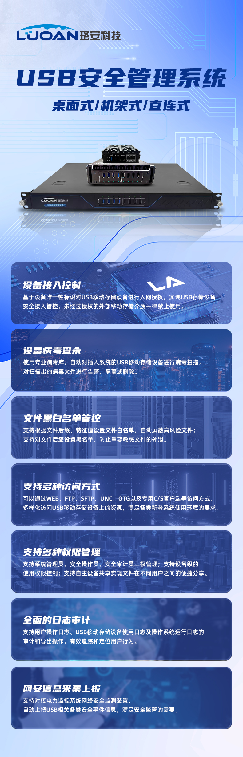 珞安科技作為國內工控安全領域技術先進、實力深厚的優(yōu)秀企業(yè),針對USB移動存儲介質防護難題,自主研發(fā)USB安全管理系統(tǒng),通過技術手段與管理制度相結合來加強移動介質的管控,實現(xiàn)移動介質的權限控制、無毒驗證、操作審計等方面的全流程管控,滿足工業(yè)企業(yè)USB移動存儲介質安全管理需求。