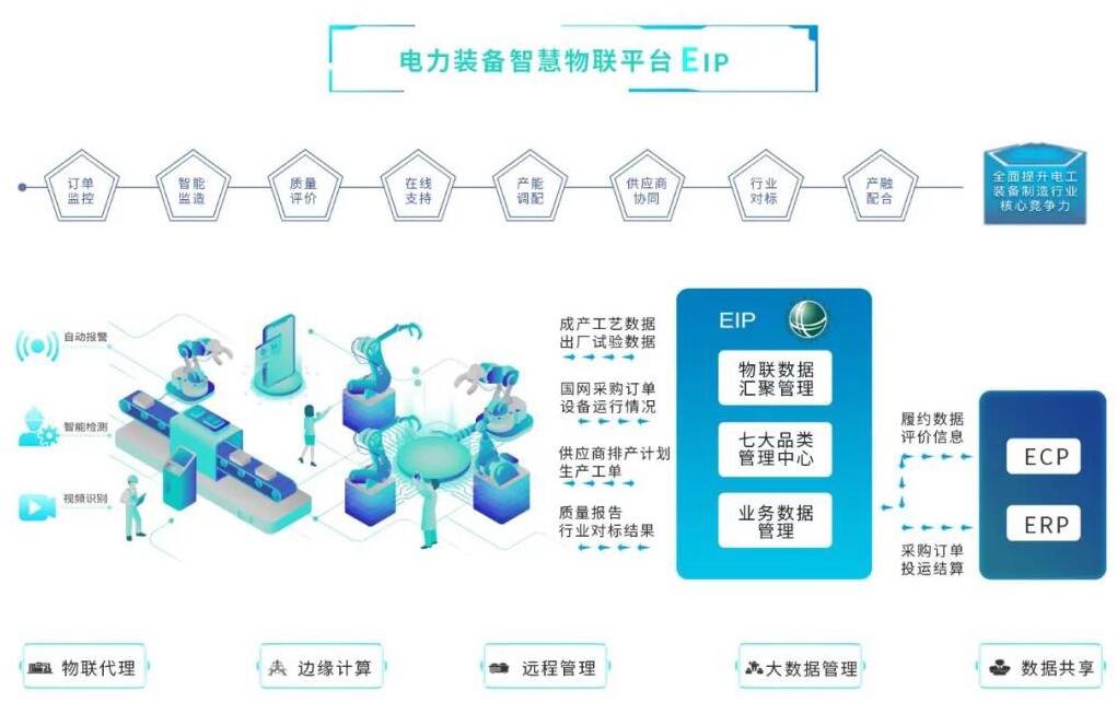 EIP包括工廠側(cè)供應(yīng)商數(shù)據(jù)采集中心(供應(yīng)商側(cè)工作)、智慧物聯(lián)網(wǎng)關(guān)、智慧物聯(lián)品類管理中心、智慧物聯(lián)管理模塊四部分,構(gòu)建智能監(jiān)造、訂單跟蹤、產(chǎn)能分析、在線支持、質(zhì)量評價(jià)、行業(yè)對標(biāo)、履約協(xié)同、產(chǎn)融融合等核心功能。