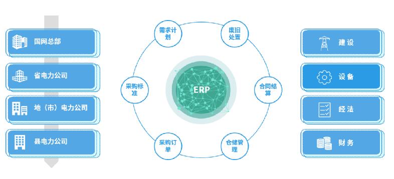 企業(yè)資源管理系統(tǒng)ERP(Enterprise Resource Planning,簡稱ERP)著力實(shí)現(xiàn)“資源一盤棋”,通過與ECP、EIP等系統(tǒng)緊密集成,總部、省、市、縣縱向體系貫通,設(shè)備、經(jīng)法、財(cái)務(wù)等橫向?qū)I(yè)協(xié)同,實(shí)現(xiàn)采購訂單、庫存物資、資金結(jié)算等企業(yè)資源統(tǒng)籌管控。該系統(tǒng)主要由計(jì)劃管理、合同管理、倉儲管理和廢舊物資處置管理四個(gè)業(yè)務(wù)子模塊組成。