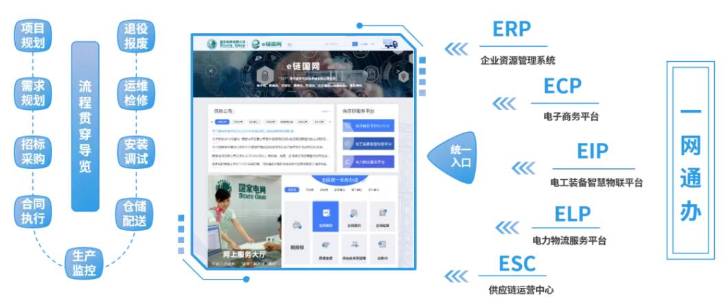 “e鏈國網(wǎng)”一站式服務(wù)門戶構(gòu)建現(xiàn)代智慧供應(yīng)鏈業(yè)務(wù)體系統(tǒng)一的PC前端窗口,以新一代電子商務(wù)平臺ECP2.0、企業(yè)資源系統(tǒng)ERP、電工裝備智慧物聯(lián)平臺EIP、電力物流服務(wù)平臺ELP、供應(yīng)鏈運(yùn)營中心ESC等核心系統(tǒng)作為底層業(yè)務(wù)支撐,向內(nèi)外部用戶提供供應(yīng)鏈相關(guān)的業(yè)務(wù)流程和信息服務(wù),提升對內(nèi)部用戶、供應(yīng)鏈伙伴的服務(wù)水平。