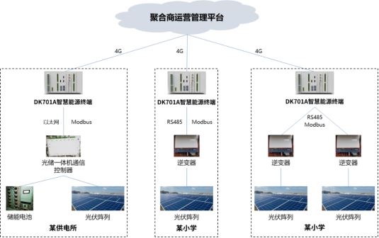 基于DK701智能終端平臺的優(yōu)勢特性,目前江行智能已成功開發(fā)DK701A智慧能源終端和DK701E儲能EMS就地控制器,并應(yīng)用到虛擬電廠聚合商運營管理系統(tǒng)及數(shù)字配電網(wǎng)臺區(qū)儲能等項目建設(shè),在光伏、儲能、充電樁等具體場景發(fā)揮了重要作用。以國網(wǎng)寧夏某公司打造的聚合商運營管理系統(tǒng)為例,通過在供電所、小學配置智慧能源終端,可將自身所擁有的分布式光伏、分布式儲能、電采暖等可調(diào)節(jié)資源數(shù)據(jù)接入省級虛擬電廠運營管理平臺,實現(xiàn)對可調(diào)節(jié)資源的可觀、可測、可調(diào)、可控。