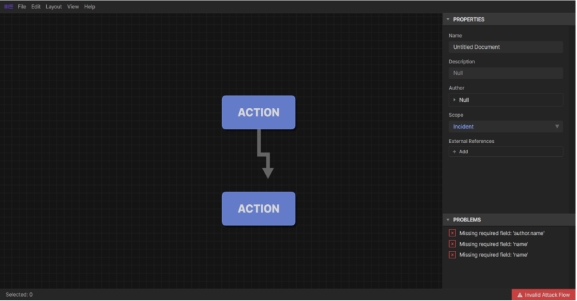 2.攻擊鏈建模編輯器:在瀏覽器中運(yùn)行,幾分鐘內(nèi)便可完成攻擊流程的創(chuàng)建。該編輯器提供了一個(gè)工作空間,用戶(hù)可以輸入攻擊行動(dòng)及其他背景信息,通過(guò)繪制箭頭,用戶(hù)可將這些信息編織成一個(gè)攻擊流程,明確展示事件或活動(dòng)中觀察到的攻擊技術(shù)執(zhí)行順序。