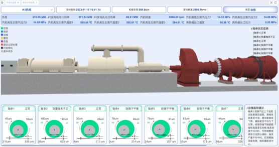 (兩張)圖注:系統(tǒng)主機(jī)首頁可集中顯示汽輪發(fā)電機(jī)組/輔機(jī)運(yùn)行狀態(tài),實(shí)時監(jiān)視軸承振動水平、重要參數(shù)的變化情況