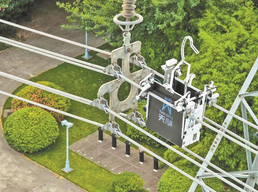2022年,“天擎”機(jī)器人投用,集成基于深度學(xué)習(xí)的缺陷檢測(cè)算法和高精度視覺識(shí)別技術(shù),能夠準(zhǔn)確識(shí)別絕緣子串上的銷釘缺失等情況。依托“激光雷達(dá)+視覺SLAM多傳感器融合定位”技術(shù),“天擎”機(jī)器人能在百米高空中精準(zhǔn)定位隱患點(diǎn),識(shí)別直徑僅有4毫米的銷孔,完成銷釘抓取、穩(wěn)定對(duì)位、準(zhǔn)確插入等操作,用時(shí)不超過1分鐘。此外,“天擎”機(jī)器人有著基于超材料的抗電磁干擾外殼,能有效屏蔽特高壓強(qiáng)電磁場(chǎng)干擾,保障通信控制信號(hào)通暢。