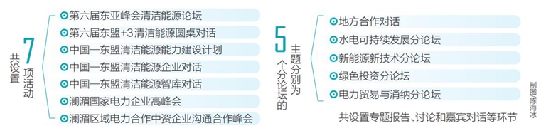 本次中國—東盟清潔能源合作周以“跨越山海 共享未來”為主題,活動期間將舉辦第六屆東亞峰會清潔能源論壇、第六屆東盟+3清潔能源圓桌對話、中國—東盟清潔能源能力建設計劃、中國—東盟清潔能源企業(yè)對話、中國—東盟清潔能源智庫對話、瀾湄國家電力企業(yè)高峰會、瀾湄區(qū)域電力合作中資企業(yè)溝通合作峰會等7項活動。5場分論壇的主題分別為“地方合作對話”“水電可持續(xù)發(fā)展分論壇”“新能源新技術(shù)分論壇”“綠色投資分論壇”“電力貿(mào)易與消納分論壇”,設置了專題報告、討論和嘉賓對話等環(huán)節(jié)。