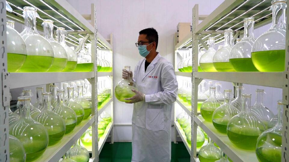 形態(tài)各異的容器中,微藻或深或淺、綠意萌動(dòng)……山西安泰集團(tuán)公司利用自主研發(fā)系統(tǒng)捕捉燃煤煙氣所含的二氧化碳,作為微生物微藻的生長(zhǎng)基,生成高附加值、高營(yíng)養(yǎng)價(jià)值的藻粉產(chǎn)品。
