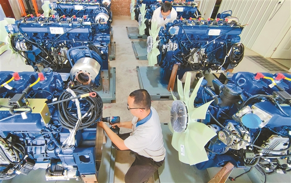 在山西榆新甲醇發(fā)動(dòng)機(jī)有限公司生產(chǎn)車間,工作人員正在安裝發(fā)動(dòng)機(jī)零部件。 謝晉攝