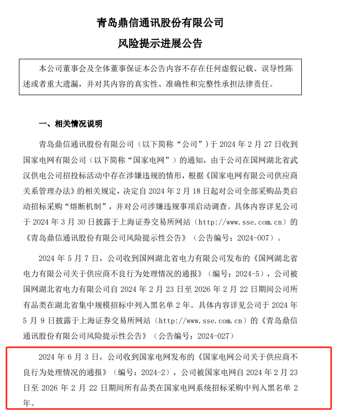 鼎信通訊6月4日晚間公告,6月3日,公司收到國家電網(wǎng)發(fā)布的《國家電網(wǎng)公司關(guān)于供應(yīng)商不良行為處理情況的通報》,公司被國家電網(wǎng)自2024年2月23日至2026年2月22日期間所有品類在國家電網(wǎng)系統(tǒng)招標(biāo)采購中列入黑名單2年。
