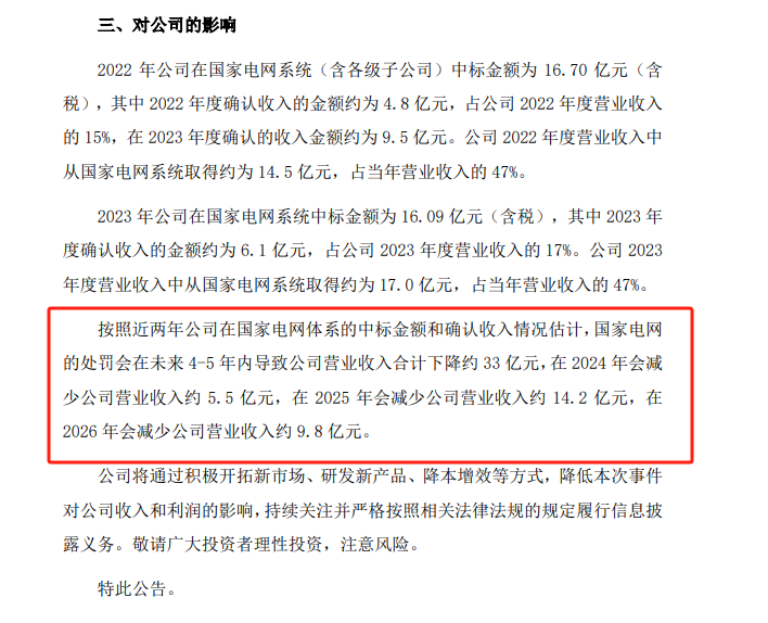 公告顯示,2022年鼎信通訊在國家電網(wǎng)系統(tǒng)(含各級子公司)中標(biāo)金額為16.7億元(含稅),其中2022年度確認(rèn)收入的金額約為4.8億元,占公司2022年度營業(yè)收入的15%。公司2022年度營業(yè)收入中,從國家電網(wǎng)系統(tǒng)取得約14.5億元,占當(dāng)年營業(yè)收入的47%。2023年,鼎信通訊在國家電網(wǎng)系統(tǒng)中標(biāo)金額為16.09億元(含稅),其中2023年度確認(rèn)收入的金額約為6.1億元,占公司2023年度營業(yè)收入的17%。公司2023年度營業(yè)收入中,從國家電網(wǎng)系統(tǒng)取得約17億元,占當(dāng)年營業(yè)收入的47%。按照近兩年公司在國家電網(wǎng)體系的中標(biāo)金額和確認(rèn)收入情況估計,國家電網(wǎng)的處罰會在未來4-5年內(nèi)導(dǎo)致公司營業(yè)收入合計下降約33億元,在2024年會減少公司營業(yè)收入約5.5億元,在2025年會減少公司營業(yè)收入約14.2億元,在2026年會減少公司營業(yè)收入約9.8億元。